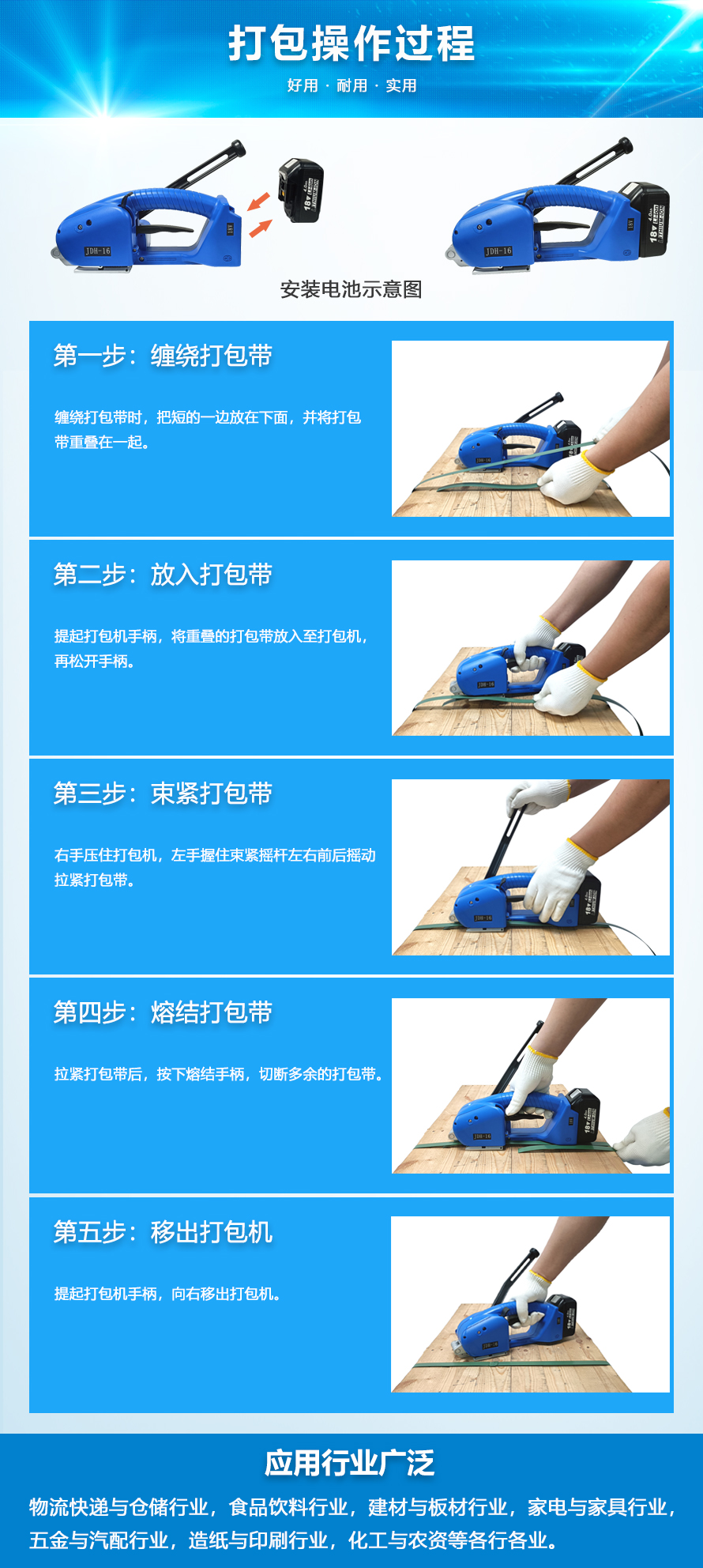 简要介绍: JDH-16半自动手提打包机采用手动可控束紧方式,适合PP PET带材质打包;特点:机身轻巧,方便移动,打带无需扣件,接口牢固而美观。